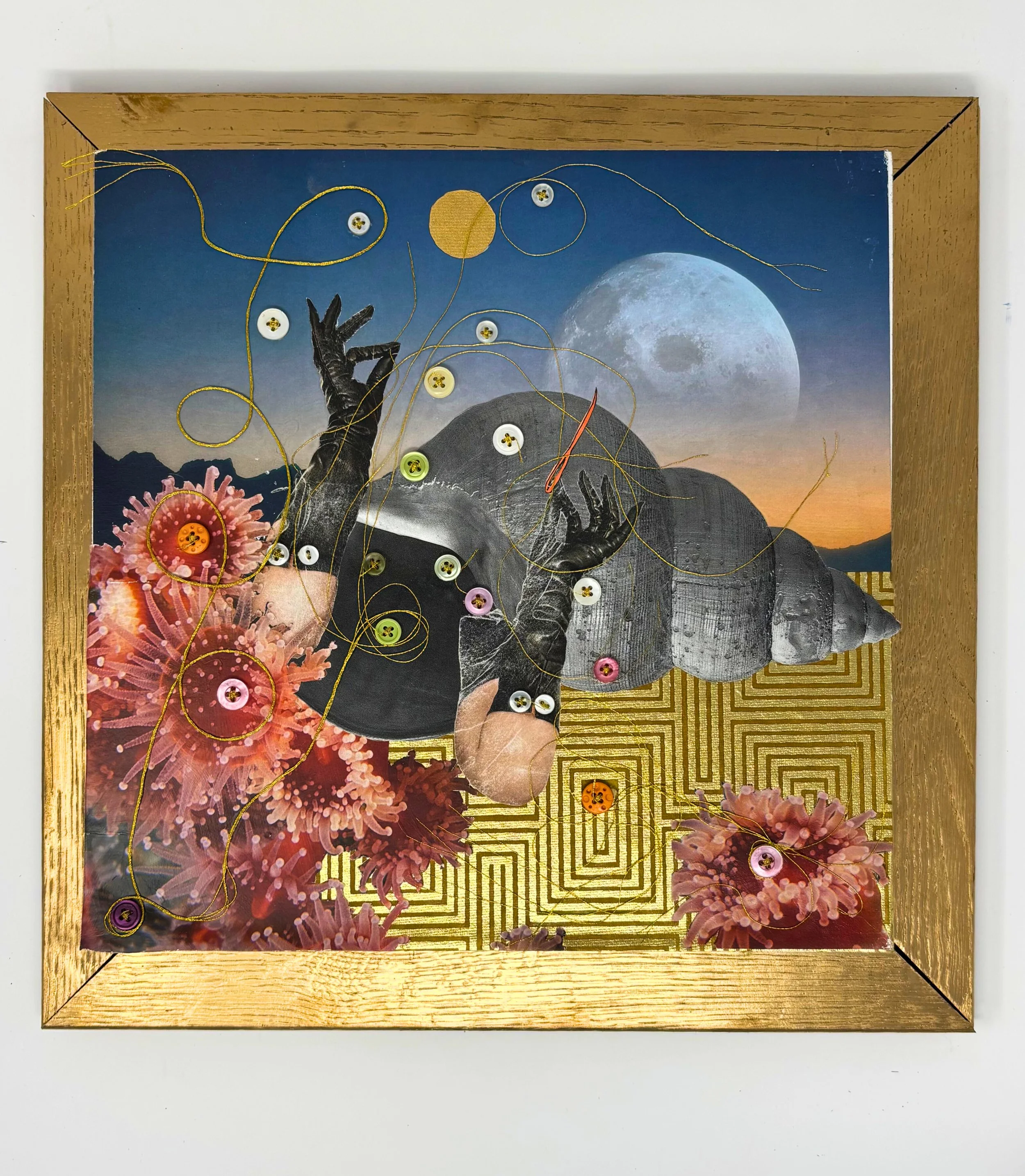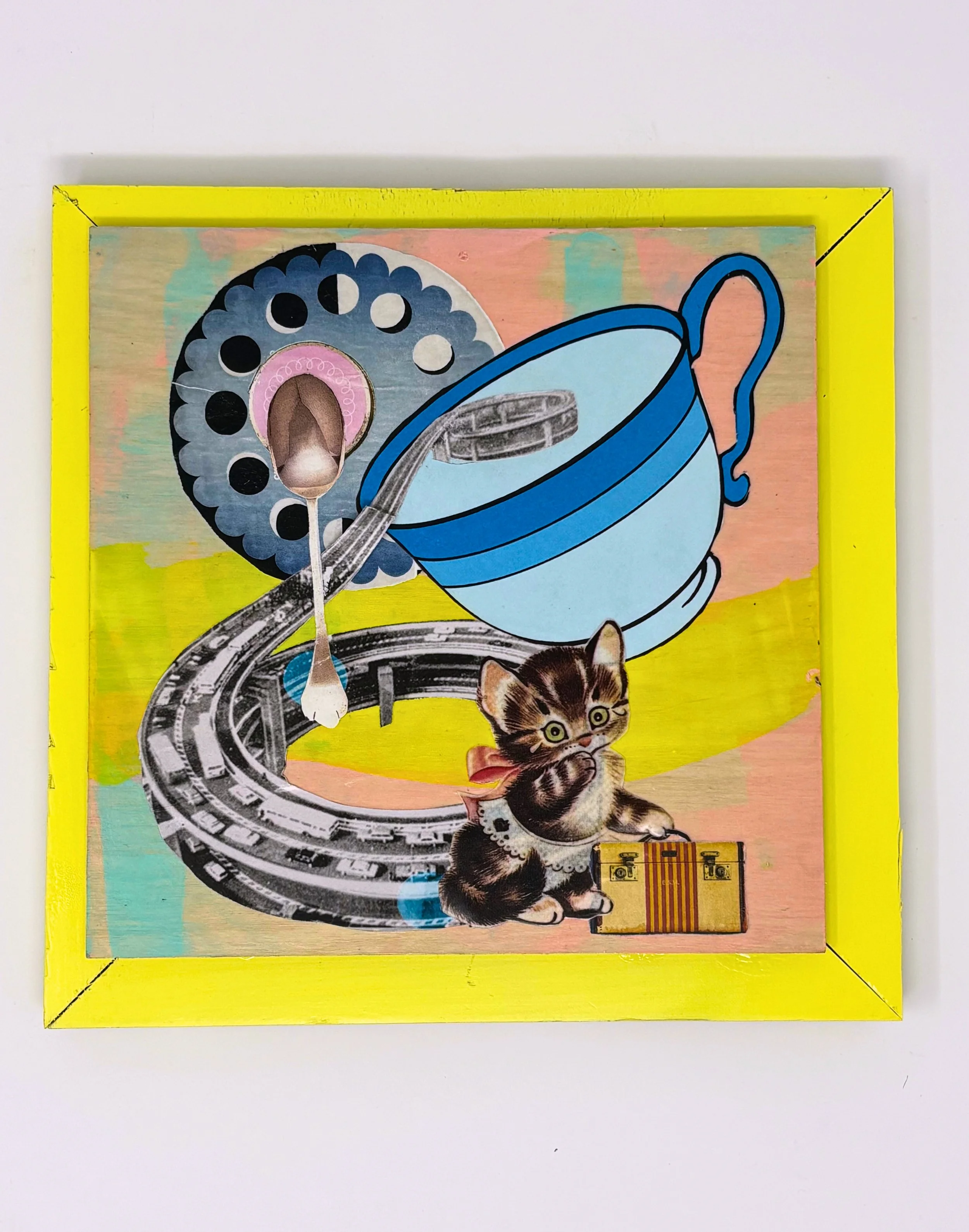 My work unites my love for storytelling, editing and thrift shopping. I’m intrigued by archetypes and patterns found in dreams, literature, music, pop culture and the natural world. I combine images gleaned from discarded books, magazines and other paper ephemera as well as found objects, sewing notions, and my own painting and drawing.